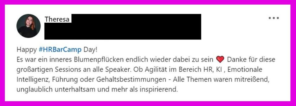 Es gibt wenige HR Events, die wirklich den Unterschied machen. Das HR BarCamp gehört definitiv dazu. Doch warum lange Reden schwinden, wenn die ehemaligen Teilnehmenden ihre Feedbacks aus freien Stück in LinkedIn posten. Hier kannst Du alle Argumente nachlesen, warum das HR BarCamp Berlin den Unterschied macht. Der nächste Termin am 12./13.02.2026 wartet auf Dich!